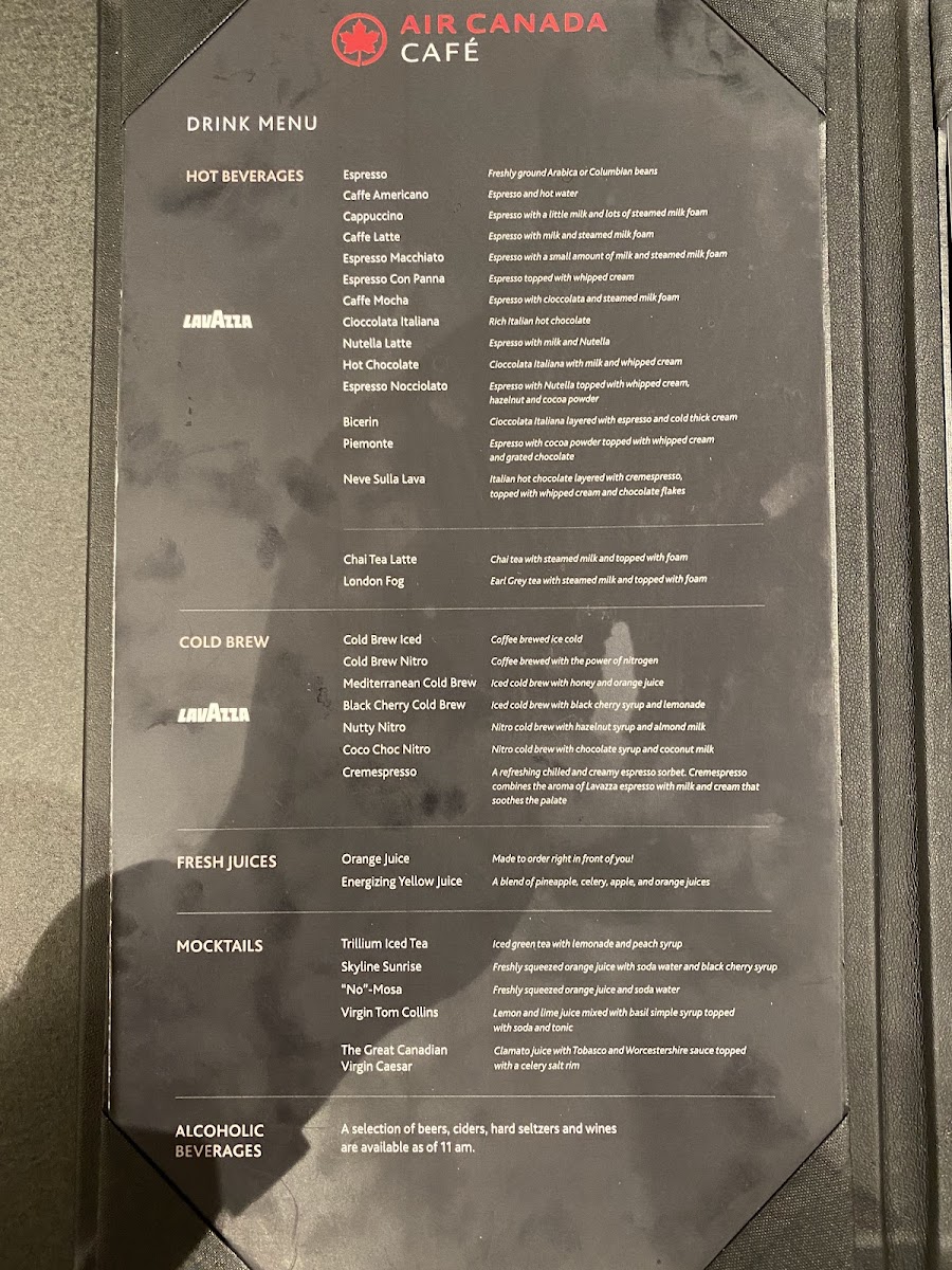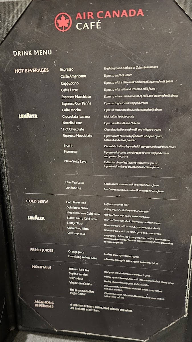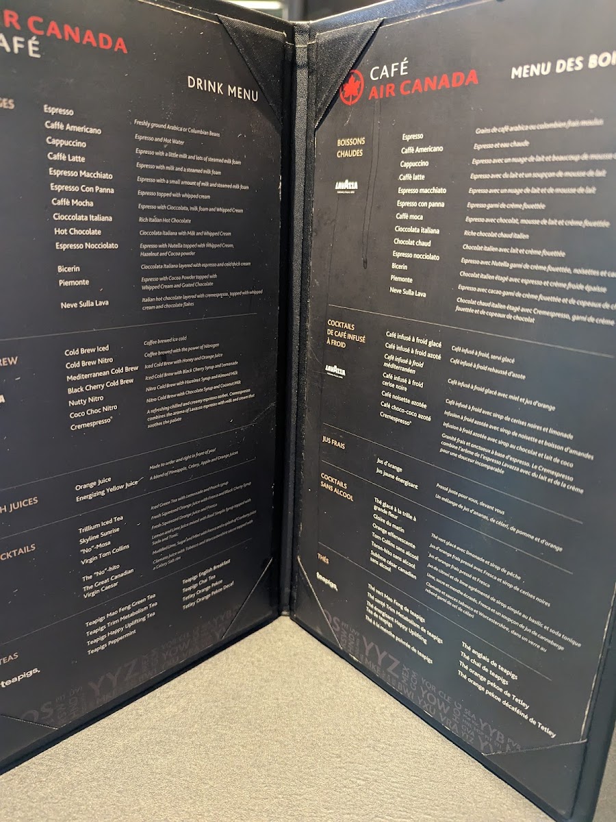 Introducing the menu of Air Canada Cafe, a modern oasis nestled in the bustling Toronto Pearson International Airport. This cafe offers a refreshing alternative to the larger lounges, featuring a menu that highlights exquisite coffee and quick bites. Guests can indulge in a variety of Lavazza espresso drinks, from a robust Caffe Americano to the delightful Nutella Latte. For those seeking something different, the cafe serves seasonal mocktails like the vibrant Skyline Sunrise.